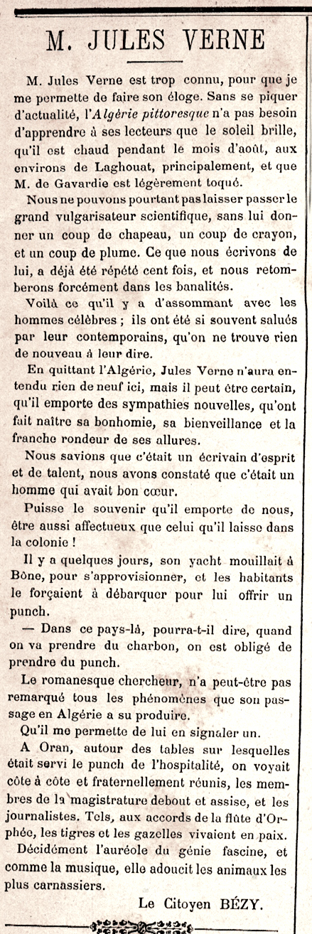 On leaving Algeria, Jules Verne may not have heard anything new here, but it can be certain, that he will carry new sympathies that will arise due to his good nature, his benevolence, and the well-rounded nature of his interests.